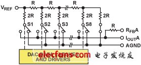 DAC的一個基本構(gòu)建模塊是一個簡單的開關(guān)。圖3所示為最簡單的電壓輸出DAC架構(gòu),包括一個Kelvin分壓器,溫度計式DAC,全譯碼器。這種DAC也可稱為電阻串(string)DAC。圖中所示的是一個