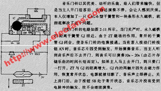 28 下圖是由于簧管磁敏傳感器構(gòu)成的音樂電子門鈴電路。該門鈴按觸一次可連續(xù)演奏幾首樂曲,可以幫助客人驅(qū)散等待的焦急。