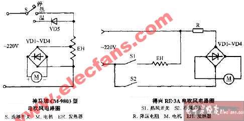以下是一例典型的電吹風(fēng)電路,在該電路內(nèi)有3 個(gè)主要元器件,第一個(gè)是風(fēng)扇電動(dòng)機(jī)M,第二個(gè)是加熱器EH,第三個(gè)是轉(zhuǎn)換開關(guān)S1,其中開關(guān)S1 是雙刀四擲開關(guān)。