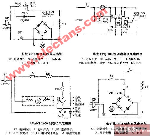 以下是一例典型的電吹風電路,在該電路內有3 個主要元器件,第一個是風扇電動機M,第二個是加熱器EH,第三個是轉換開關S1,其中開關S1 是雙刀四擲開關。