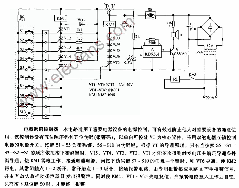 用該密碼控制集成電路組成的密碼控制組件,可方便地與外圍執(zhí)行機(jī)構(gòu)聯(lián)按,具有開鎖,錯(cuò)碼報(bào)警等功能。
