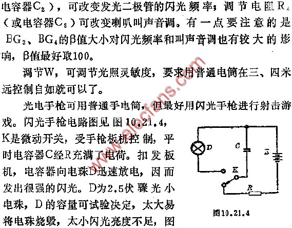 電子打靶電路由電子手槍和光電靶兩部分組成。圖(a)是電子手槍電路,它是一個單管直流逆變器.由三極管VT、電阻R1、電容c1和電感L1、L2、L3等組成變壓器耦合振蕩電路,將3V直流電壓轉變成峰值為