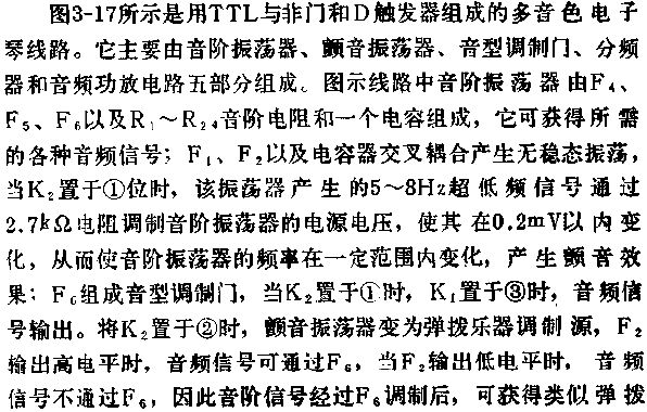 圖中所示是用TTL與非門和觸發(fā)器組成的玩具電子琴線路。圖示線路可同時發(fā)出主音和顫音,它還可模擬小號、黑