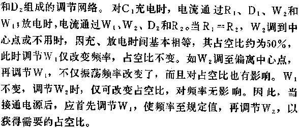 圖中是一個(gè)占空比可以從0.01~99.99%調(diào)節(jié)的補(bǔ)救電路。圖中二極管D1為充電導(dǎo)管,D2則為放電引導(dǎo)管,當(dāng)電位器W的中心端滑向右端時(shí),占空系數(shù)D為: