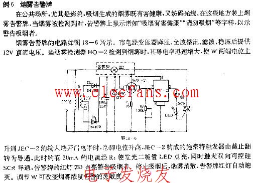 煙霧報(bào)警牌電路圖:在公共場所,尤其是影院,吸煙生成的煙霧即有害健康,又妨礙光線。在這些地方裝上煙霧被檢測到時(shí),告警牌上顯示諸如吸煙有害健康請匆吸煙等字樣,以示警告吸煙者。