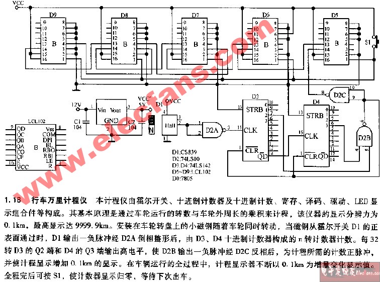 本計(jì)程儀由霍爾開關(guān),十進(jìn)制計(jì)數(shù)器及十進(jìn)制計(jì)數(shù),寄存,驅(qū)動,LED顯示組合件等構(gòu)成。