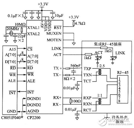 太網(wǎng)收發(fā)電路由RJ45接口、耦合變壓器、以太網(wǎng)收發(fā)器,以及收發(fā)器與調(diào)制驅(qū)動電路、接收解調(diào)電路之間的接口組成,其中以太網(wǎng)收發(fā)器是核心單元,直接決定了系統(tǒng)的工作性能。