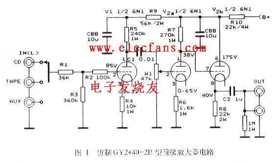 前級放大器電路如圖1所示,左右聲道完全相同。它由兩級電壓放大加陰極輸出器組成,V1為第一級電壓放大?,F(xiàn)代數(shù)碼音源CD、DVD的輸出電壓一般都在2V左右,信號從IN輸入,經(jīng)R1衰減,通過柵極防振電阻R 2加至V1柵極,V1將信號放大,然后從屏極取出放大后的信號電壓經(jīng)C1耦合到下一級。W1為V1交流負(fù)載的一部分,又是V2的柵極回路,同時起著總音量的控制作用。