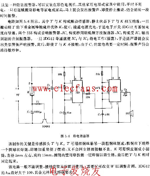 ??? 如果竊賊企圖移動車罩或車門。短路就被拆除.電路就會馬上啟動警報提醒你。要切斷警報只要用S1開關將電路復位即可。汽車防盜器由兩塊定時器芯片組成:一塊用于報警電路(圖1中的IC2),另一