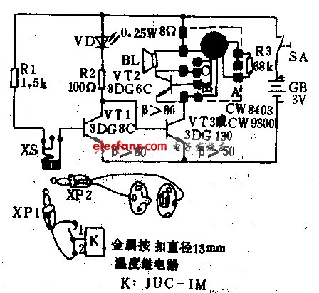 音樂(lè)集成電路A受控工作,寶寶掀被情況下喇叭BL發(fā)出呼叫聲。寶寶掀被提醒報(bào)警器電路: