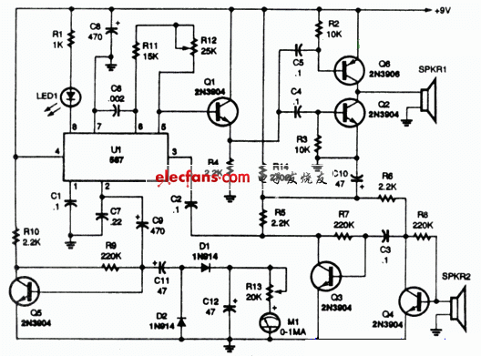 工作時,發(fā)送部分和接收部分同時進行,將SPKRl和SPKR2同方向?qū)蕶z測目標,彼此相距約為0.3米。若目標不動,則收到的超聲頻率與發(fā)送頻率相同,F(xiàn)M輸出為零,M1無讀數(shù)。若目標移動,則根據(jù)多普勒效應(yīng)按收頻率比發(fā)送頻率或高或低,F(xiàn)M輸出不再是零,移動越快,讀數(shù)越大。若倍壓整流電路改接成耳機,則根據(jù)聲音高低還可辨別移動的方向。物體移動檢測報警器電路: