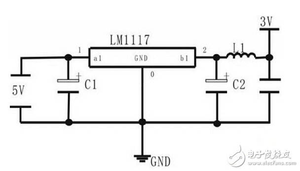在網(wǎng)絡(luò)節(jié)點(diǎn)中電源是能源中心,在節(jié)點(diǎn)中起著非常重要的作用,特別是在無(wú)線通信系統(tǒng)中,電源不光是能源供應(yīng)者,它也直接影響通信的質(zhì)量。器件對(duì)加到輸入引腳或輸出引腳的電壓通常是有限制的。這些引腳由二極管或分離元件接到Vcc。如果接入的電壓過(guò)高,電流將會(huì)通過(guò)二極管或分離元件流向電源。而現(xiàn)行的電壓輸出模塊中多為5V電壓,因而需要設(shè)計(jì)出一個(gè)輸出穩(wěn)定的5V轉(zhuǎn)3V的電壓調(diào)節(jié)模塊。在該系統(tǒng)中,選用專為通信控制芯片提供轉(zhuǎn)換電壓的LM1117,它具有功耗低,體積小的優(yōu)點(diǎn)。又因?yàn)殡妷褐泻性S多高頻干擾源,這些高頻成分很容易經(jīng)過(guò)電源進(jìn)入通信系統(tǒng)中。