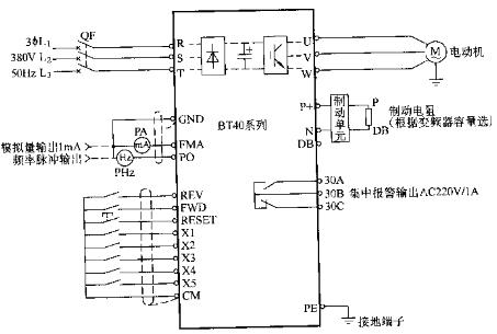 BT12S作風(fēng)機(jī)、水泵專用變頻器的接法電路圖 如圖所示