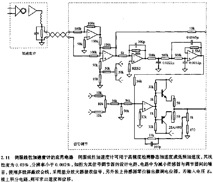 1 精密加速度計需要反相模式放大器,因為它通常對輸出設備充電。該放大器用于將電荷轉換為電壓輸出。這是帶有直流伺服的加速度計的示例。