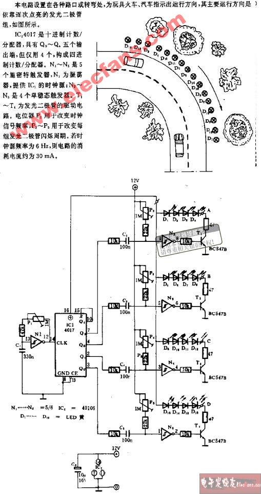 在城建中,免不了開挖路面鋪設(shè)管道,夜間為防止車輛和行人跌入坑道,需要設(shè)置光控自動閃爍路標(biāo)燈,白天燈不亮,天黑它會自動發(fā)出閃爍的紅光,引起行人的注意。該電路如附圖所示。