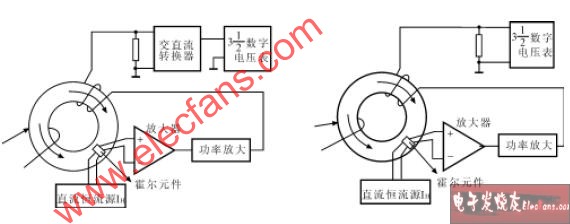 霍爾鉗形電流表將磁芯做成張合結(jié)構(gòu),在磁芯開口處放置霍爾器件,將環(huán)形磁芯夾在被測電流流過的導線外,即可測出其中流過的電流。這種鉗形表既可測交流也