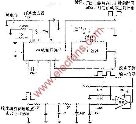 汽車發(fā)動機(jī)的測速觸點(diǎn)或其它傳感器所送來輸入脈沖先經(jīng)過濾波,再送給由3130CMOS運(yùn)算放大器所組成的比較器,于是便完成了對輸入脈沖的整形處理,接著,這些脈沖通過4046鎖相環(huán)路饋送給除N計(jì)數(shù)器。N個數(shù)值應(yīng)根據(jù)發(fā)動機(jī)的缸數(shù)來設(shè)定。最后,輸出信號應(yīng)送往下級計(jì)數(shù)器,這個計(jì)數(shù)器將在0.5S的時間隙內(nèi)對輸出頻率進(jìn)行計(jì)數(shù),由此便得到發(fā)動機(jī)或轉(zhuǎn)軸的轉(zhuǎn)速。