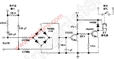 電話線路上的直流電壓一般在掛機時大約為45-50V,摘機時大約為6V,本電路利用這種電壓降來啟動繼電器,繼電器對盒式磁帶錄音機進行控制,音頻信號經(jīng)過該電路的有關(guān)網(wǎng)絡(luò)接到錄音機傳聲輸入端。
