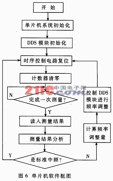 通電以后單片機首先進行初始化,然后設置DDS模塊的工作模式等參數(shù),再進行時序控制電路的復位并對所有計數(shù)器進行清零操作。隨后單片機不斷查詢測量完成信號。當時序控制電路在雷達觸發(fā)脈沖的作用下完成一次測量時?熏就通過該信號通知單片機,單片機一旦查詢到測量完成便立即讀入測量結(jié)果。然后進行分析,是標準中頻頻率時不進行本振頻率的調(diào)整,直接準備下一脈沖周期的測量,若不是則計算所需的頻率調(diào)整量,控制DDS頻率合成模塊進行頻率調(diào)整,然后再準備下一脈沖周期的測量。
