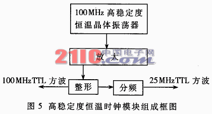 本機振蕩器的頻率穩(wěn)定度是影響雷達接收機性能的關鍵性指標。由于DDS頻率合成方法的輸出頻率穩(wěn)定度僅僅取決于其時鐘的頻率穩(wěn)定度,因此選用頻率穩(wěn)定度高達10-9的恒溫晶體振蕩器作為整個系統(tǒng)的時鐘。恒溫晶體振蕩器輸出的100MHz高穩(wěn)正弦波經(jīng)放大后整形為標準的TTL方波,一路作為頻率測量模塊的時間標準,另一路經(jīng)F161分頻為25MHz的TTL方波,經(jīng)電平轉(zhuǎn)換后作為AD9854的外部時鐘信號,利用AD9854內(nèi)部的可編程倍頻器倍頻12倍使AD9854工作在300MHz的內(nèi)部時鐘頻率下。高穩(wěn)定度恒溫時鐘模塊組成框圖如圖5所示。