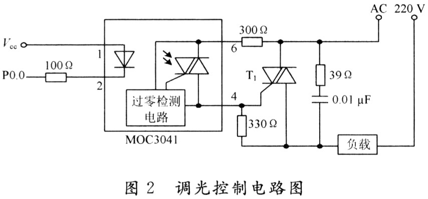 ??? 調光控制電路如圖2所示,用光電耦合器MOC3041作為晶閘管的驅動器,同時能實現強、弱電的隔離。MOC3041內部有過零檢測電路,當P0.O為低電平時,輸出端6引腳、4引腳之間的電壓稍過零時,MOC304.1內部雙向晶閘管導通,觸發(fā)外部晶閘管T1導通。當PO.0為高電平時,MOC304l內部雙向晶閘管關斷,從而外部晶閘管T1也關斷。