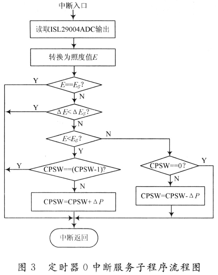 ??? 在程序中通過比較得到的照度值E和標準照度值ES來調整CPSW的值,實現自動調光控制。CPSW的初值設為0,并在O~CNSW之間分為若干檔,比如10檔,得到每次CPSW的調整值△P=(CNSW-1)/10,以實現較為平滑的調整。計算出照度值后和標準照度值ES比較,如果小于標準照度值ES,則在當前CPSW的基礎之上增加△P,直到達到CPSW的最大值(CNSW-1);如果大于標準照度值ES,則在當前CPSW值的基礎上減少△P,直到CPSW的值為0,照明設備關閉。同時為了避免較小的照度變化導致自動調光,可以根據標準照度值確定一個調光允許的照度差值△ES,如果當前得到的照度值和上次所得到的照度值差的絕對值△E不小于△ES,才進行調光控制。