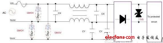陶瓷氣體放電管在開關(guān)電源里面應(yīng)用的非常多,經(jīng)常與壓敏電阻串聯(lián)一起使用。如下圖所示,氣體放電管與壓敏串聯(lián)放置在輸入的L/N與大地線之間,他們的作用是在共模雷擊的時(shí)候起到一個(gè)抑制雷擊電壓的作用,雷擊