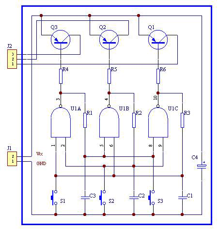 電路結(jié)構(gòu)簡(jiǎn)單,按下任何一鍵,相應(yīng)一路開(kāi)通,其他二路關(guān)閉。觸點(diǎn)抖動(dòng)不影響電路正常工作,抗干擾好。