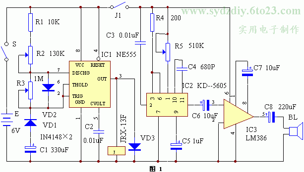 本電路我們暫且稱其為“仿聲原理電子驅(qū)鼠器”,它不是我們常見(jiàn)的利用高強(qiáng)度超聲波驅(qū)趕老鼠的工作方式,而是利用電子電路產(chǎn)生一種逼真的貓叫聲,用模擬出來(lái)的這種叫聲嚇阻老鼠不讓其在一定范圍內(nèi)活動(dòng)。至于這種驅(qū)鼠