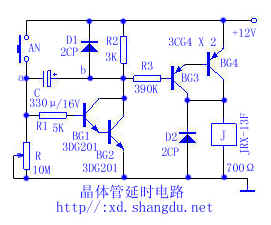 晶體管溫控電路圖如圖是晶體管組成的繼電器延時吸合電路。剛接通電源時,16μF電容上電壓為零,兩個三極管都截止,繼電器不動作。隨著16μF電容的充電,過一段時間后,其上電壓達到高電平,兩個三極管都導通,繼電器延時吸合。延時時間可達60s。延時的時間長短可通過10MΩ電阻來調(diào)節(jié)。