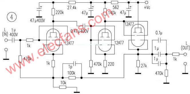 ??? 原理圖如圖4所示?該線路取自法國“JADIS JP2000”旗艦前級經典線路?其采用12AT7作兩級電壓放大,并用12AT7作陰極輸出?使前后級阻抗能很好地匹配,并提高負載能力?為了得到較大的輸出電流和較低的輸出阻抗,該電路將雙三極管并聯(lián)使用,這也是其特點之一,其音質醇和通透,比馬蘭士7更具有濃烈的音樂味,高頻與低頻也明顯勝于馬蘭士 7,最適合欣賞古典音樂?