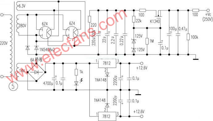 ? 圖5是一款簡單易制?性能出眾的膽機穩(wěn)壓電源?該線路結合了電子管與晶體管的特點,取長補短,同時也降低了電源變壓器的工藝要求?高壓采用日立場效應管穩(wěn)壓,燈絲采用直流+12.6V供電可進一步降低整機噪聲,以上膽前級除改進型馬蘭士7外(該板為膽整流?膽穩(wěn)壓?主板?電源一體化大板雙面鍍金設計)均可與該電源板搭配使用?