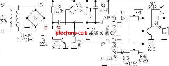 下圖是由于簧管磁敏傳感器構(gòu)成的音樂電子門鈴電路。該門鈴按觸一次可連續(xù)演奏幾首樂曲,可以幫助客人驅(qū)散等待的焦急。