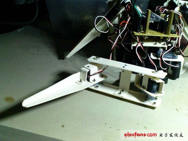 ● 但是現(xiàn)在,為了動力更足,為了舵機(jī)的壽命,也顧不得保持原來的芊芊細(xì)腿了,于是決定對腿的機(jī)械機(jī)構(gòu)進(jìn)行加固——該肥還是讓它肥一點吧,健康最重要,嘿嘿!
