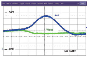 圖2展示NIS5132的一對曲線。導(dǎo)通較低的曲線時,激活的是短路曲線。一旦電流降低至低于這個電平,F(xiàn)ET就完全導(dǎo)通(線性區(qū)域),接下來面對的就是過載電平。如果電流達到過載電平,F(xiàn)ET的柵驅(qū)動將立即減小,而漏極至源極電壓將增加,并會將工作模式改為短路電平模式。這器件在過載電平時不能維持穩(wěn)態(tài)工作。
