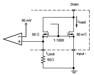 電子熔絲使用SENSEFETTM來開關(guān)電源、限制電流及監(jiān)測輸出電流。SENSEFET的優(yōu)勢是僅測量小部分的負(fù)載電流。沒有SENSEFET,全部負(fù)載電流將要流經(jīng)感測電阻,而這將需要大功率、極低阻抗的電阻。與價格不足1美分的小型片式電阻相比,這些電阻較昂貴。