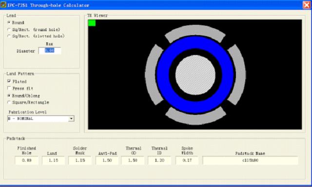 點(diǎn)擊軟件“PTH計(jì)算器”圖標(biāo),就進(jìn)入PTH計(jì)算器模式,在該模式下可以自動(dòng)計(jì)算通孔器件通孔焊盤尺寸。