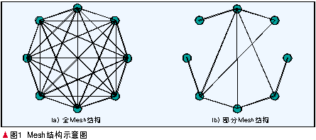 無線網(wǎng)狀網(wǎng)是使用多跳的全無線網(wǎng)絡(luò),數(shù)據(jù)流進(jìn)出有線Internet網(wǎng)關(guān)。與平面Ad hoc相比,無線網(wǎng)狀網(wǎng)呈現(xiàn)分層的特點(diǎn),其節(jié)點(diǎn)按照功能可以分成Mesh路由器和Mesh客戶機(jī)兩類。這些Mesh節(jié)點(diǎn)可以組成全Mesh結(jié)構(gòu),也可以組成部分Mesh結(jié)構(gòu)。所謂全Mesh結(jié)構(gòu)是指網(wǎng)絡(luò)中的任意兩個節(jié)點(diǎn)都可以實(shí)現(xiàn)直接連接,而部分Mesh結(jié)構(gòu)是指只有整個網(wǎng)絡(luò)中的部分節(jié)點(diǎn)之間可以直接通信。如圖1所示。