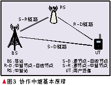 協(xié)作中繼也被稱作為協(xié)作分集,其原理來自于“虛擬天線陣列”思想。協(xié)作中繼就是單路徑中繼的一個擴(kuò)展,在源節(jié)點(diǎn)S和目的節(jié)點(diǎn)D之間可以引入一個或者多個具有共同覆蓋區(qū)域的節(jié)點(diǎn)充當(dāng)中繼節(jié)點(diǎn)R,目的節(jié)點(diǎn)可以合并來自源節(jié)點(diǎn)和來自中繼節(jié)點(diǎn)的數(shù)據(jù)。這樣可以緩解終端無法配置較多天線的壓力[11]。我們以如圖3為例,源節(jié)點(diǎn)、中繼節(jié)點(diǎn)、目的節(jié)點(diǎn)分別由基站(BS)、中繼站(RS)和用戶終端(UT)來充當(dāng)。