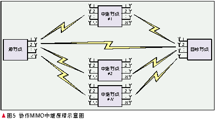 在任何一個無線中繼鏈路中,都可以使用協(xié)作中繼。而且為了充分利用頻譜資源及多輸入多輸出(MIMO)技術(shù),在源節(jié)點(diǎn)、中繼節(jié)點(diǎn)和目的節(jié)點(diǎn)中都可以配置多天線,充分利用不同RS的協(xié)作,可以在目的節(jié)點(diǎn)實(shí)現(xiàn)協(xié)作MIMO中繼,大大提高無線中繼鏈路的數(shù)據(jù)速率?;驹砣鐖D5所示。其仿真?zhèn)鬏斔俾驶颈瘸R?guī)MIMO要高2倍左右。隨著無線技術(shù)的發(fā)展,在無線網(wǎng)狀網(wǎng)中采用協(xié)作MIMO中繼技術(shù)必將是一個發(fā)展方向[13]。