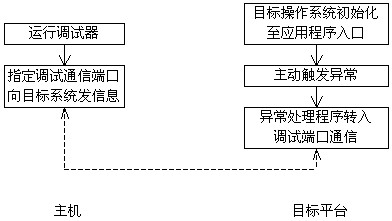 運(yùn)行于目標(biāo)操作系統(tǒng)的被調(diào)試的應(yīng)用程序要在入口處調(diào)用這個(gè)設(shè)置斷點(diǎn)的函數(shù)以產(chǎn)生異常,異常處理程序調(diào)用調(diào)試端口通信模塊,等待主機(jī)(host)上的調(diào)試器發(fā)送信息。雙方建立連接后調(diào)試器便等待用戶(hù)發(fā)出調(diào)試命令,目標(biāo)系統(tǒng)等待調(diào)試器根據(jù)用戶(hù)命令生成的指令。這一過(guò)程如下圖所示。