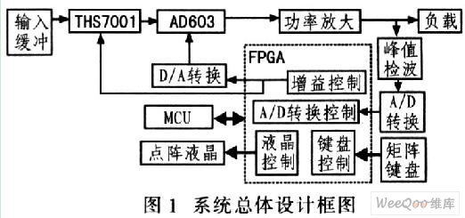 該系統(tǒng)主要由可控增益放大器、功率放大與峰值檢波、單片機(jī)顯示和控制3大模塊組成。其中可變增益放大器以THS7001和AD603為核心。單片機(jī)控制THS7001實(shí)現(xiàn)增益粗調(diào),并通過D/A轉(zhuǎn)換控制AD603實(shí)現(xiàn)增益細(xì)調(diào),從而使總增益在- 6~70 dB的寬頻帶范圍內(nèi)線性變化。前置放大器采用由寬帶電壓型反饋運(yùn)放THS4011構(gòu)成的射極跟隨器,可有效提高輸入電阻;后級功率放大器采用電流型反饋運(yùn)放AD811,提高系統(tǒng)帶負(fù)載能力。由二極管峰值檢波電路測量峰值,并通過A/D轉(zhuǎn)換、D/A轉(zhuǎn)換實(shí)現(xiàn)自動(dòng)增益控制。通過鍵盤手動(dòng)預(yù)置增益值,LCD實(shí)時(shí)顯示預(yù)置增益值并輸出有效值。其系統(tǒng)總體設(shè)計(jì)框圖如圖1所示。