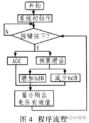 系統(tǒng)軟件設(shè)計(jì)遵循結(jié)構(gòu)化和層次化原則,由一個(gè)主程序及若干子程序構(gòu)成。主程序通過調(diào)用子程序控制子程序間的時(shí)序,從而使整個(gè)程序正常運(yùn)行。系統(tǒng)軟件設(shè)計(jì)部分由單片機(jī)和FPGA組成。單片機(jī)主要完成讀取鍵值、控制增益和顯示功能。而FPGA則作為總線控制器,管理鍵盤、液晶和A/D轉(zhuǎn)換器與單片機(jī)之間的數(shù)據(jù)交換。以O(shè)uartus II 7.2為設(shè)計(jì)環(huán)境,用Verilog HDL硬件描述語言編程,完成各功能模塊的設(shè)計(jì),并仿真測試設(shè)計(jì)好的各個(gè)模塊,再將各個(gè)模塊相互連接。程序以按鍵中斷為主線,以各項(xiàng)功能為分支,圖4為程序流程。