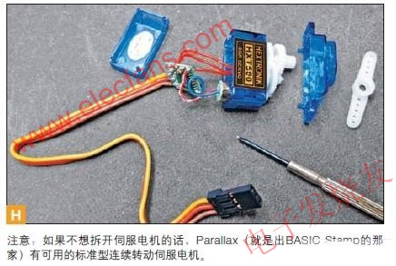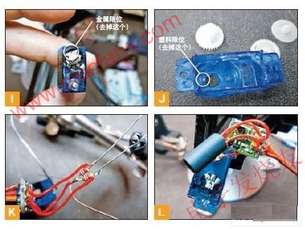 變速器的方法,這樣就得到一個(gè)連續(xù)轉(zhuǎn)動伺服電機(jī)。這個(gè)改動,部分是機(jī)械的,部分是電氣的。電氣的改動部分是將電位器改成兩個(gè)同阻值的固定電阻,機(jī)械的改動部分是將阻止電機(jī)全方位轉(zhuǎn)動的限位裝置去掉。 首先拆開伺服電機(jī)