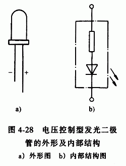 圖4-28是電壓控制型發(fā)光二極管的外形胩內部結構圖。?