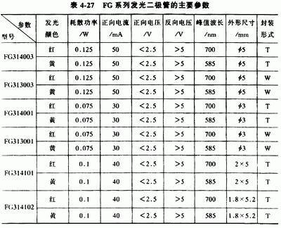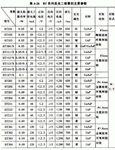 常用的國(guó)產(chǎn)普通單色發(fā)光二極管有BT(廠標(biāo)型號(hào))系列、FG(部標(biāo)型號(hào))系列和2EF系列,見表4-26、表4-27和表4-28。?