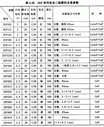 常用的高亮度紅色發(fā)光二極管的主要參數(shù)見表4-29,常用的超高亮度單色發(fā)光二極管的主要參數(shù)見表4-30。
