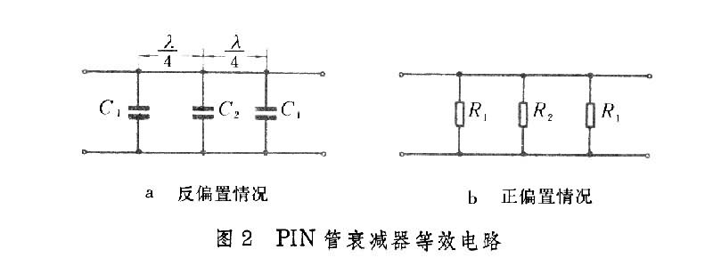 PIN管具有不同的正反向特性,當它被反向偏置時可等效為小電容而近似開路,而在正向偏置時則可等效為可變電阻,若偏壓增大,其阻值則減小。PIN管衰減器(圖1)就是利用這一特性工作的,從它的等效電路(圖2)可見,當PIN管反偏置時,衰減器即相當于濾波器,可設(shè)計成幾乎沒有衰減,而PIN管正偏置時,衰減器為一電阻衰減器,改變偏壓即可改變衰減。若正偏置衰減甚大而反向偏置衰減甚小,衰減器即成為開關(guān)器。若以調(diào)制信號作為偏置電壓,則通過衰減器的微波信號會受到幅度調(diào)制,遂成為調(diào)幅器。
