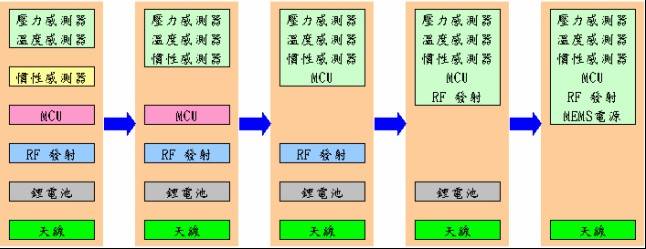??? 發(fā)展TPMS主要考量有:低功耗、配重(牽涉使用組件數(shù)量的多寡及體積)、成本。功耗跟電池使用壽命有絕對關(guān)系;而配重則牽涉到TPMS發(fā)射模塊的安裝。故TPMS設(shè)計方案的發(fā)展也依此考量為藍圖(請參考下圖)。為降低功耗,設(shè)計趨勢第一步走向內(nèi)建慣性傳感器,偵測到車輛移動才喚醒發(fā)射模塊藉以節(jié)省電能,最終目標(biāo)走向無電源模塊,即內(nèi)建MEMS電源以提供電能。至于配重及成本,整合型芯片為設(shè)計趨勢。整合胎壓傳感器與MCU,再將RF發(fā)射也包含進來,至最后將MEMS也設(shè)計在一起,不但可減小模塊體積,也節(jié)省成本提高市場競爭性。