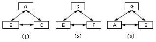 由于BITS設備無法直接對一級基準時鐘進行絕對測量,所以,只能依靠一級基準時鐘所配備的BITS設備自身的監(jiān)測功能,將網內所有的一級基準時鐘按照三個為一組的組合原則,譬如共有七個一級基準時鐘,其編號分別為A、B、C、D、E、F和G,則可以將其分為ABC、DEF和GAB三組,并通過利用E1專線,采用彼此監(jiān)測和兩兩比對的方法,實現(xiàn)不同一級基準時鐘間的相對長期頻率偏差的監(jiān)測。其比對組合和彼此監(jiān)測示意圖分別如圖4和5所示。??